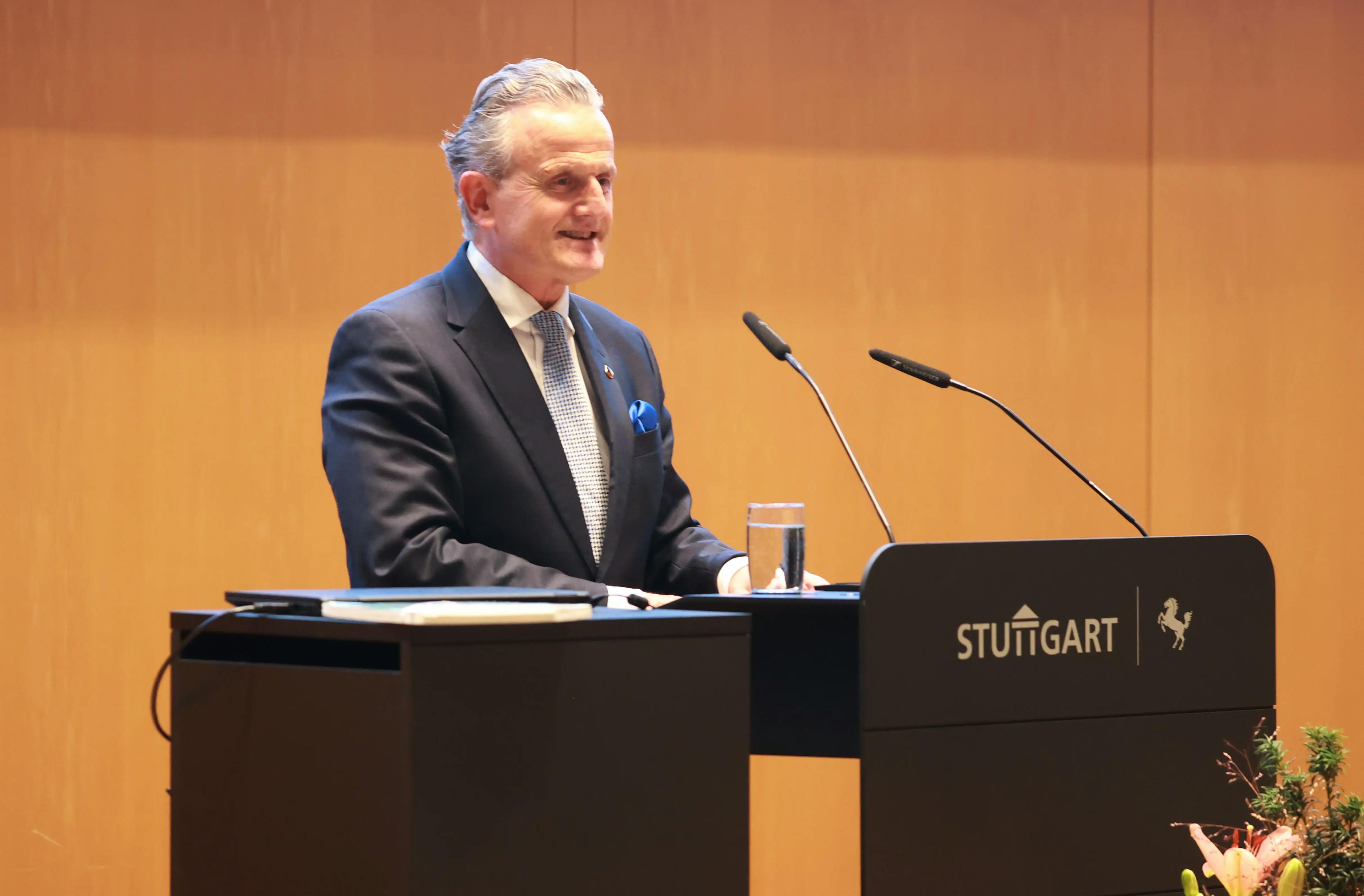 Auch die Ansprache unseres Präsidenten Dr. H.-U. Jelitto war informativ, denn er unterrichtete die Anwesenden über so manche Neuigkeiten bei den Stuttgarter Prominentenkicker. Der Höhepunkt der Verleihung war dann die Laudatio auf den Preisträger hervorragend gehalten vom Hausherrn, dem Stuttgarter Oberbürgermeister und Proki-Mitglied Dr. Frank Nopper. Er schaffte es den Werdegang des Preisträgers Dr. Eduardo Garcia eindrucksvoll zu vermitteln, wie der in Stuttgart geborene Garcia mit spanischem Namen - sein Vater war Spanier, die Mutter Deutsche- allen klar machen musste, dass er kein "Ausländer" sei, sondern ein Ur-Schwabe, der schwäbisch und nicht spanisch spricht. "Edy" Garcia studierte und promovierte in Augsburg und hatte dann als junger Mann die geniale Geschäftsidee, die vielen Ausländer, die hier bei uns leben mit ihren aus ihrer Heimat bekannten Lebensmittel zu versorgen. Es gab schon Italiener, die ihren Landsleuten italienische Pasta verkauften, aber für die zahlreichen Türken gab es noch nichts. Dr. Eduardo Garcia ließ nach Originalrezepten aus der Türkei Lebensmittel, hauptsächlich Milchprodukte hier in Württemberg produzieren und da sie so gut waren und die Türken so treu zu ihren heimatlichen Produkten sind, wurde die Erfolgsgeschichte "GAZI" geboren.